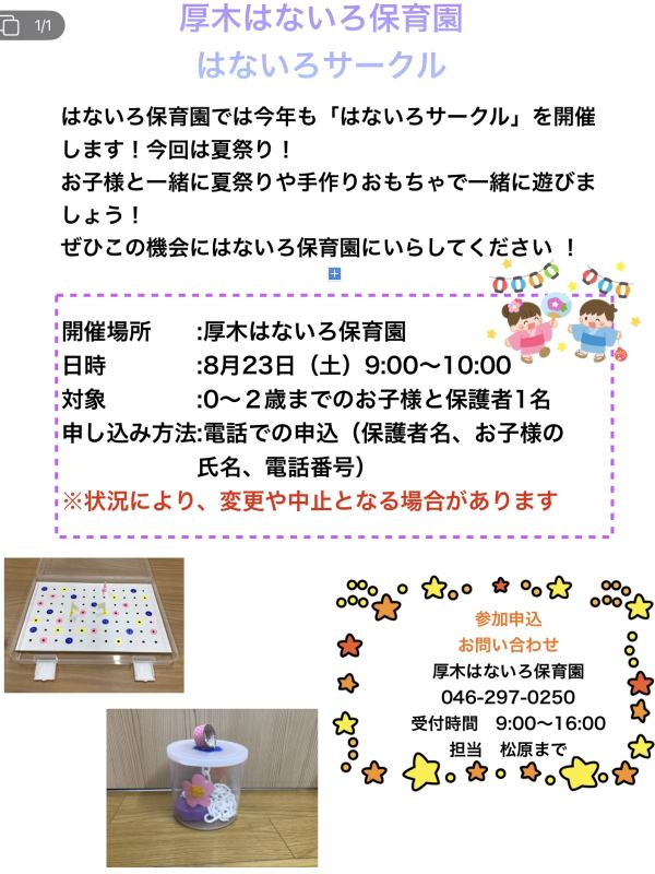 あつぎ はないろ保育園 2025/07/14 はないろサークルのご案内 8/23(土) 「はないろサークル」のご案内 あつぎはないろ保育園では、今年も「はないろサークル」を開催します。 参加のお申し込みは上のちらしをご覧になり、電話でお申し込みください。 TEL:046-297-0250 お子さまと一緒に夏祭りや手作りおもちゃで一緒に遊びましょう!