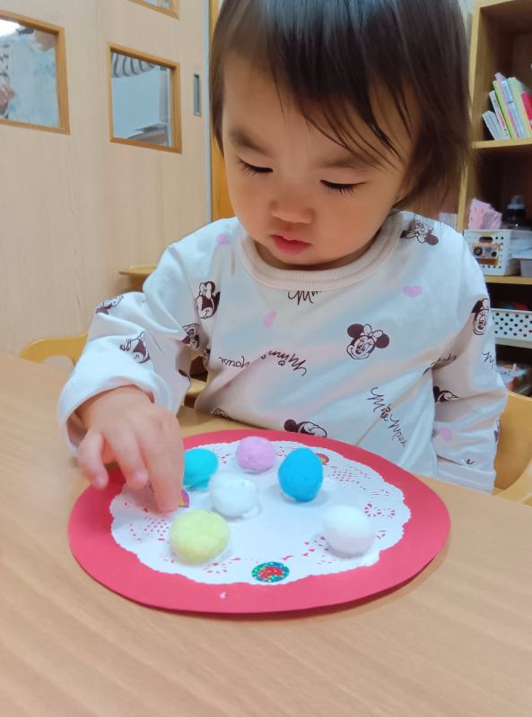 クリスマス飾りのボンボン。ペタっ。