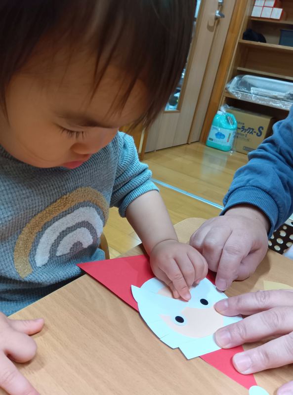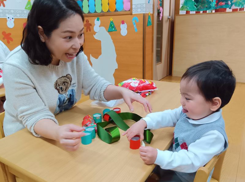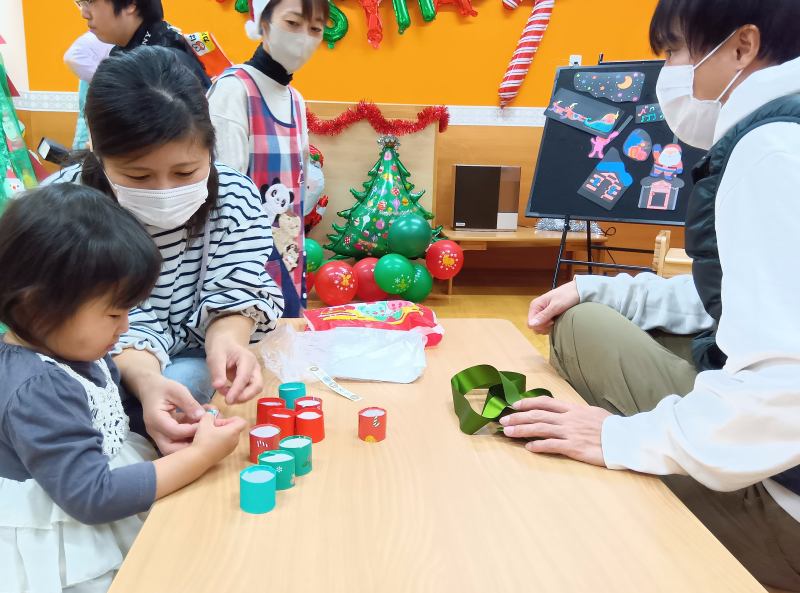クリスマス会は親子で一緒にリースを作りました。