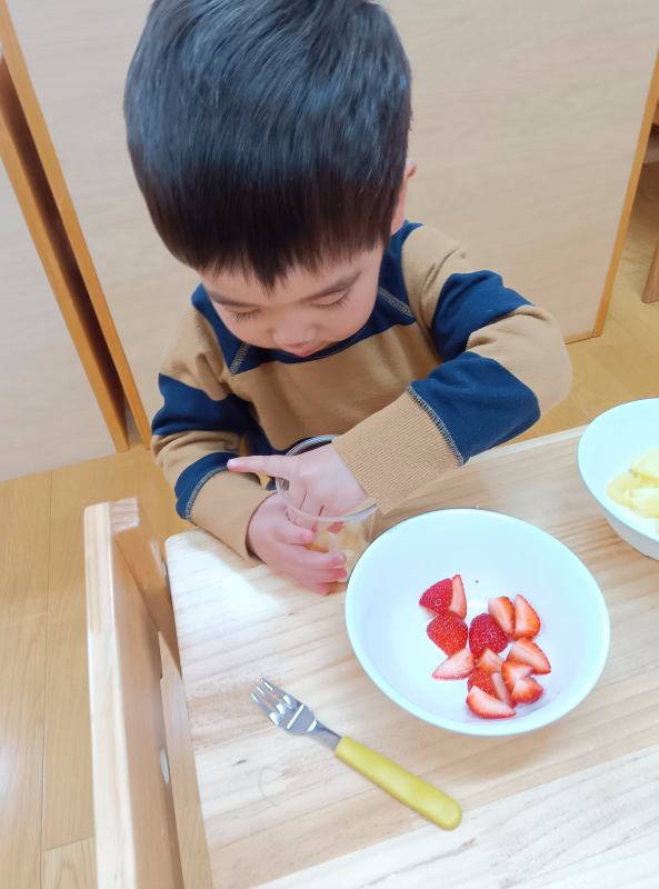 いちごをたくさん入れてケーキをつくるぞ。