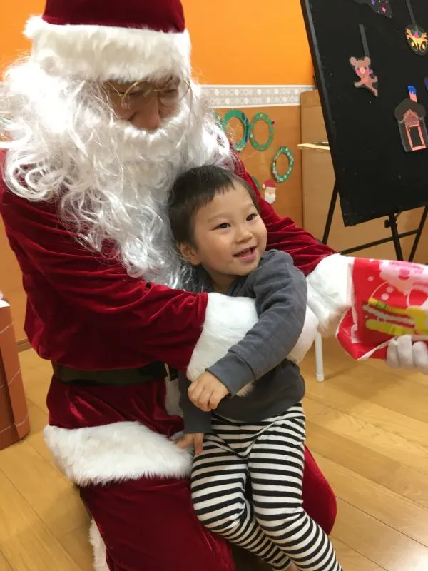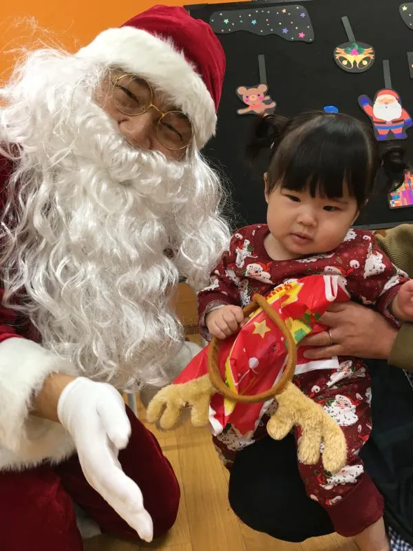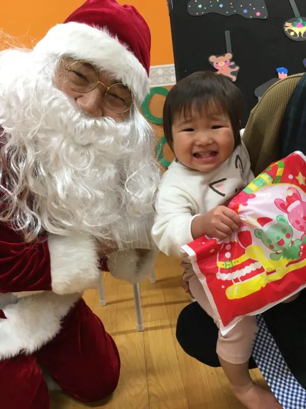 サンタさんにびっくり!でもプレゼントをもらってニコニコです。