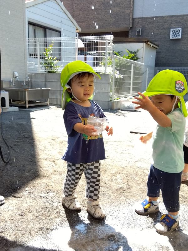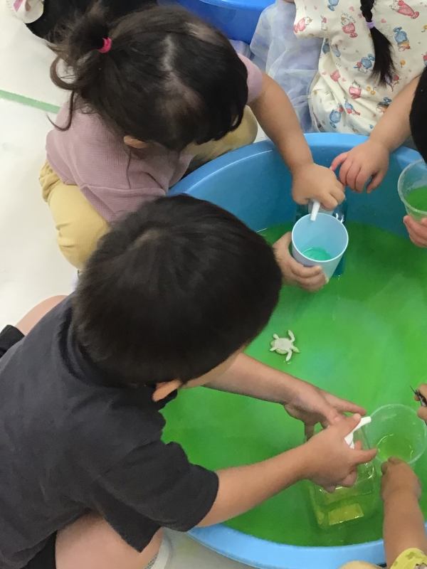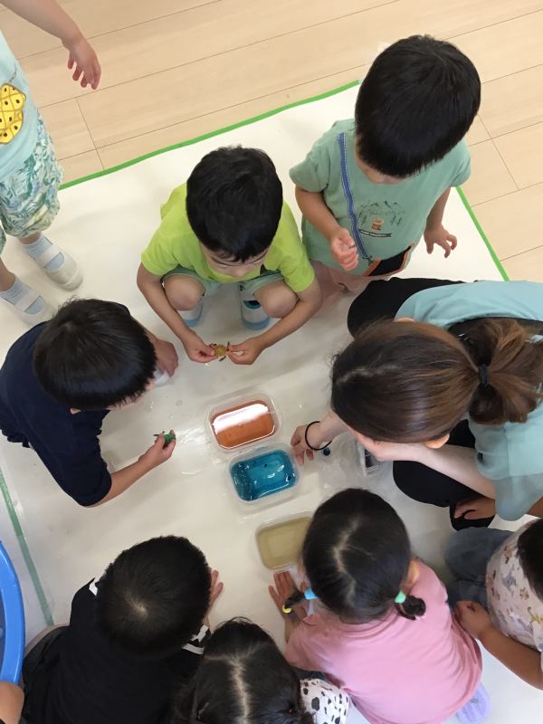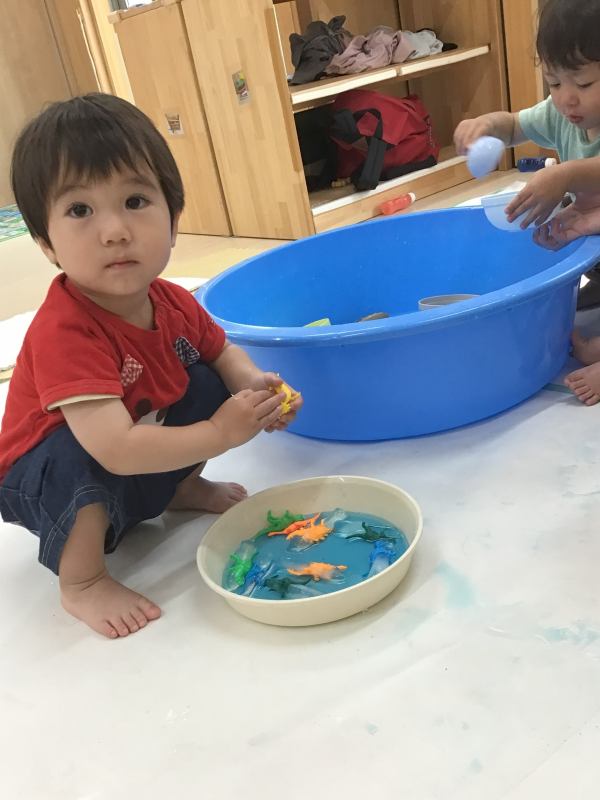 検見川はないろ保育園 2025/07/10 6月の子どもたち 氷遊び 中から何が出てくるかな? 食紅で色を付けました 色水どうしを混ぜるとどんな色になるか実験です ボディーペインティング 豪快に! 外に行けなくてもお部屋で体を動かします 雨かな?水遊びきもちいいね 乳児フロアでも氷遊び。中から出てきたのは恐竜かな?おさかな? なんでも入れたくなっちゃうね