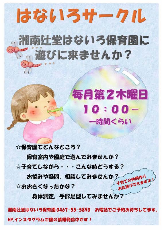 湘南辻堂はないろ保育園 2025/10/9 地域交流のお知らせ(毎月) 湘南辻堂はないろ保育園に遊びにきませんか?! 日時:毎月第2木曜日 時間:10:00から 連絡先:湘南辻堂はないろ保育園 0467-55-5890 参加ご希望の方は、電話でご連絡をお願いいたします。