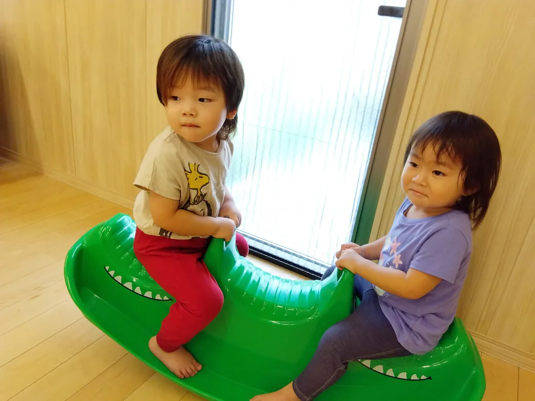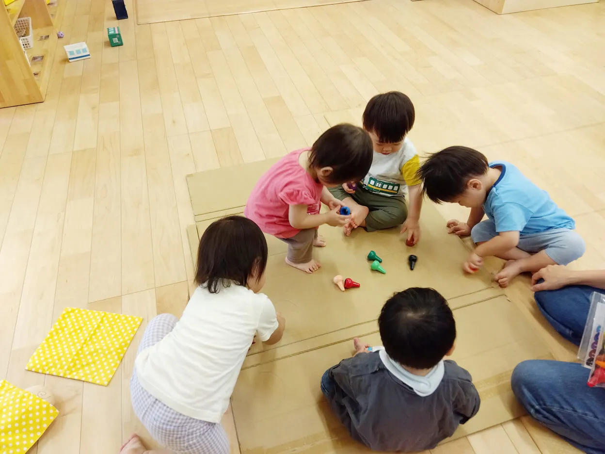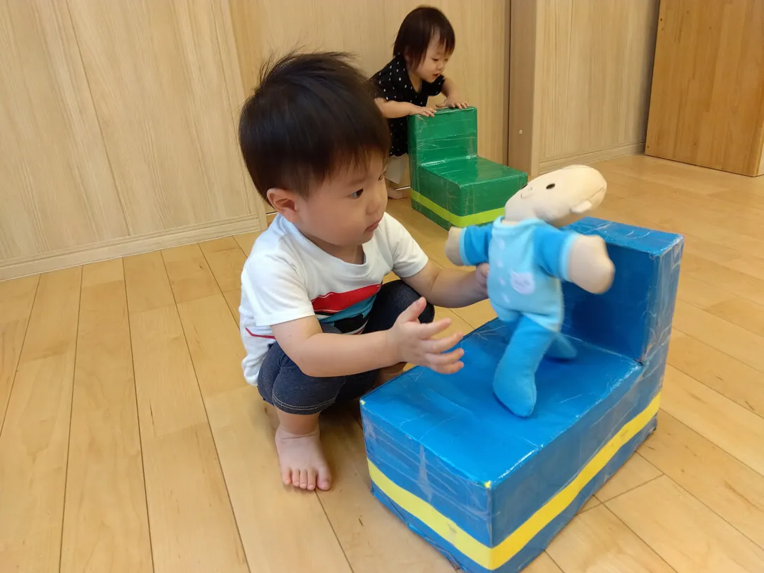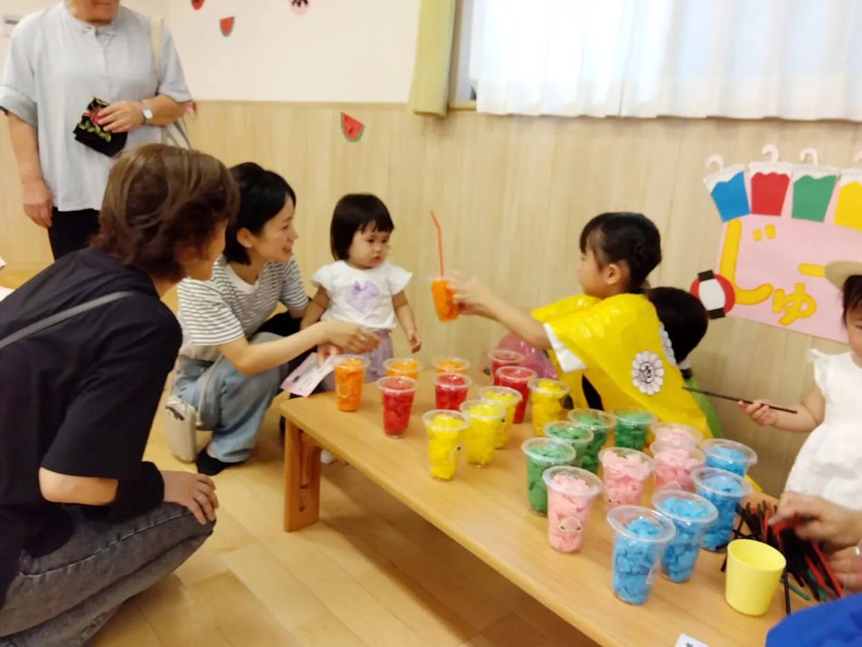 大和はないろ保育園 2024/10/15 9月の子どもたち 【親子参加行事】今年は「はないろまつり」を開催しました。 年長さんがお店屋さん役:「いらっしゃいませ!オレンジジュースですね。はい、どうぞ!」 射的:的を狙って真剣な表情です。当たるかな? 色々な車庫があります。 こちらはタワー型の車庫ですね。 ワニさんに乗ってゆらゆら~♪ 手形:大きくなった手のひらが大きな木に変身! お絵描き:みんなで段ボールにお絵描きしました。 「ここに座ってね。」 何をしているのかな?