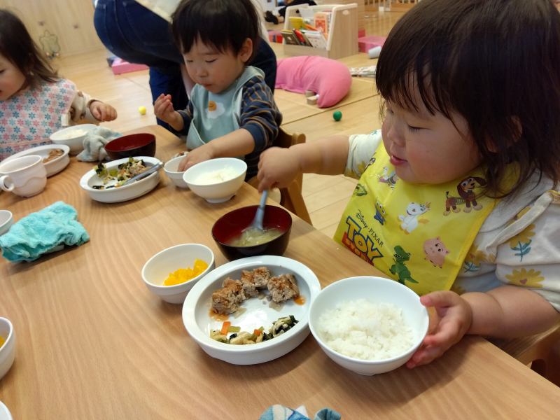 乳児クラス:給食は手づかみや食具をつかってモリモリたべます