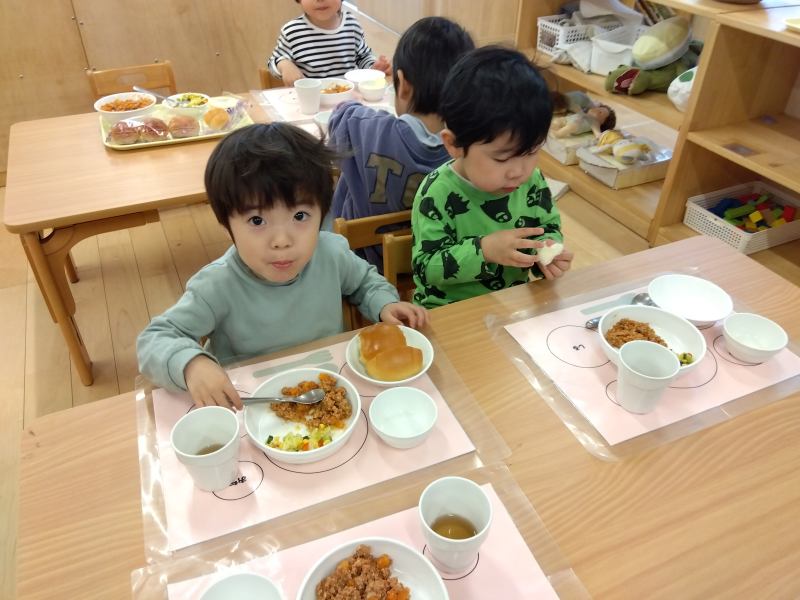 幼児クラス:ランチョンマットに自分たちで配膳してそれぞれでいただきます