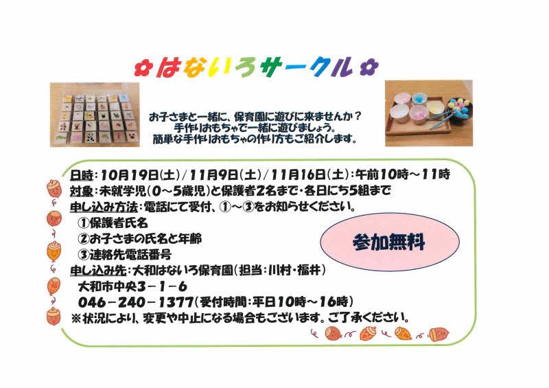 大和はないろ保育園 2024/09/24 はないろサークル開催のお知らせ 開催日:10/19(土)・11/9 (土)・11/16 (土)です。 是非ご参加ください! ※こちらをクリックするとPDFが開きます。